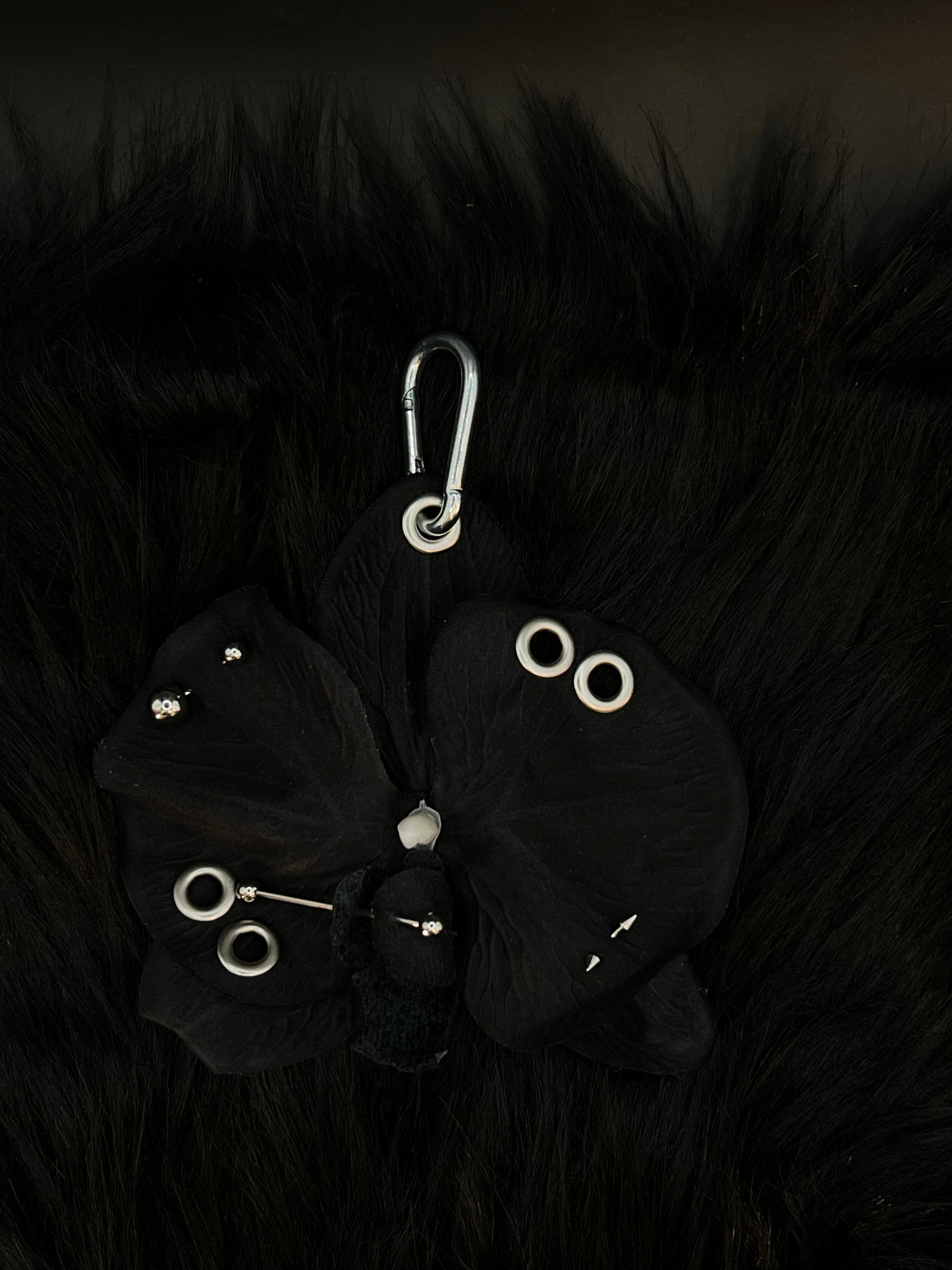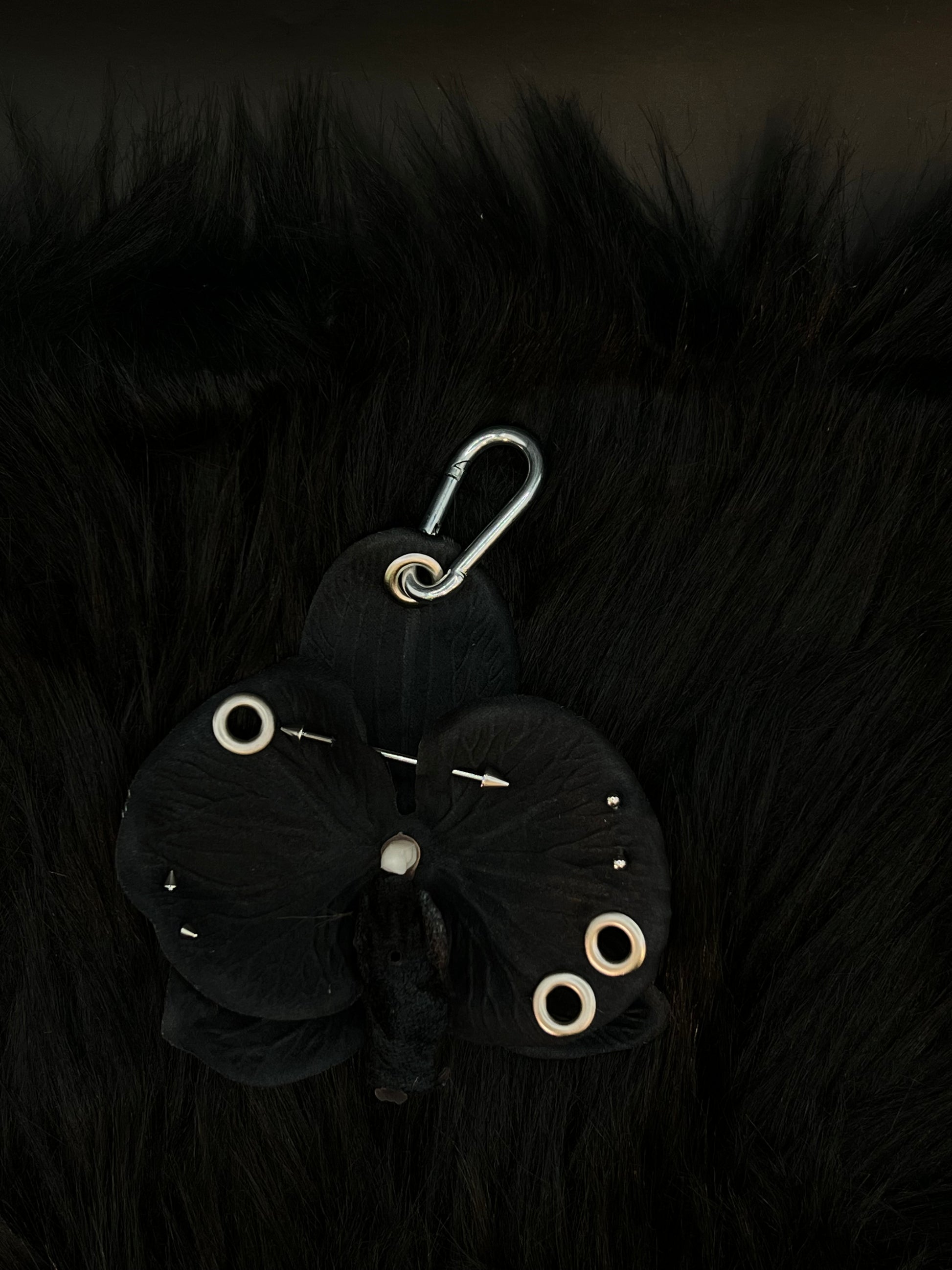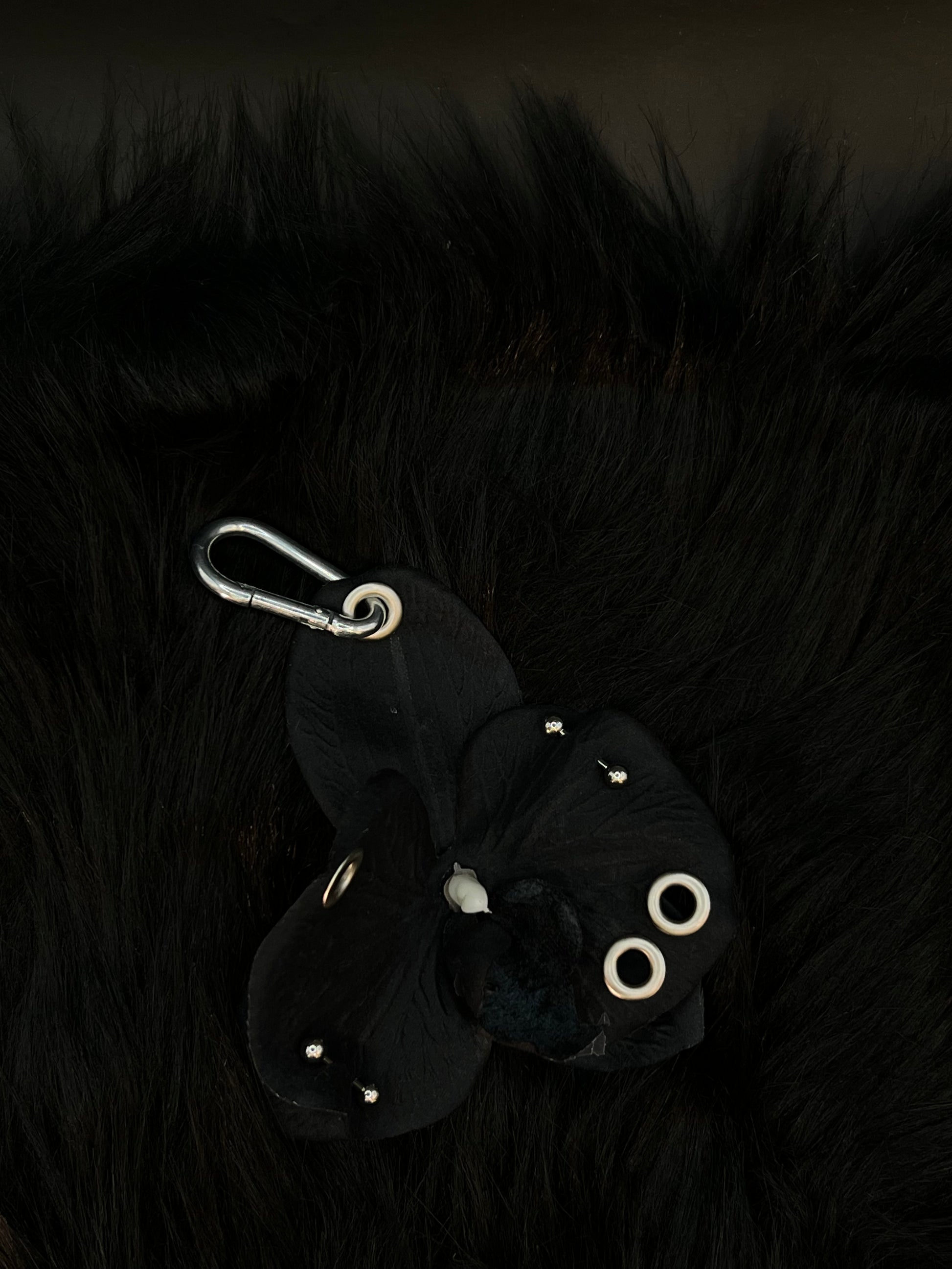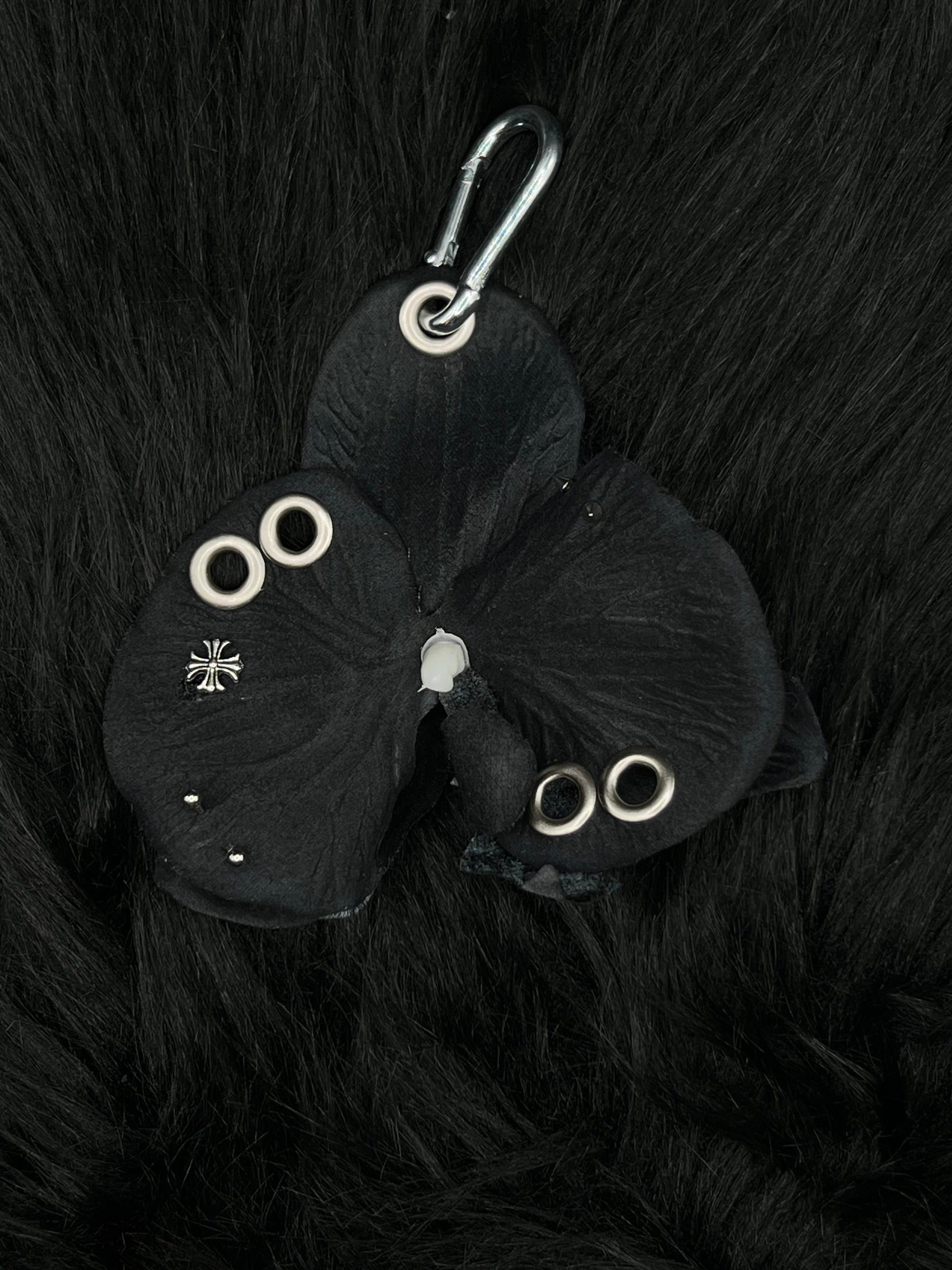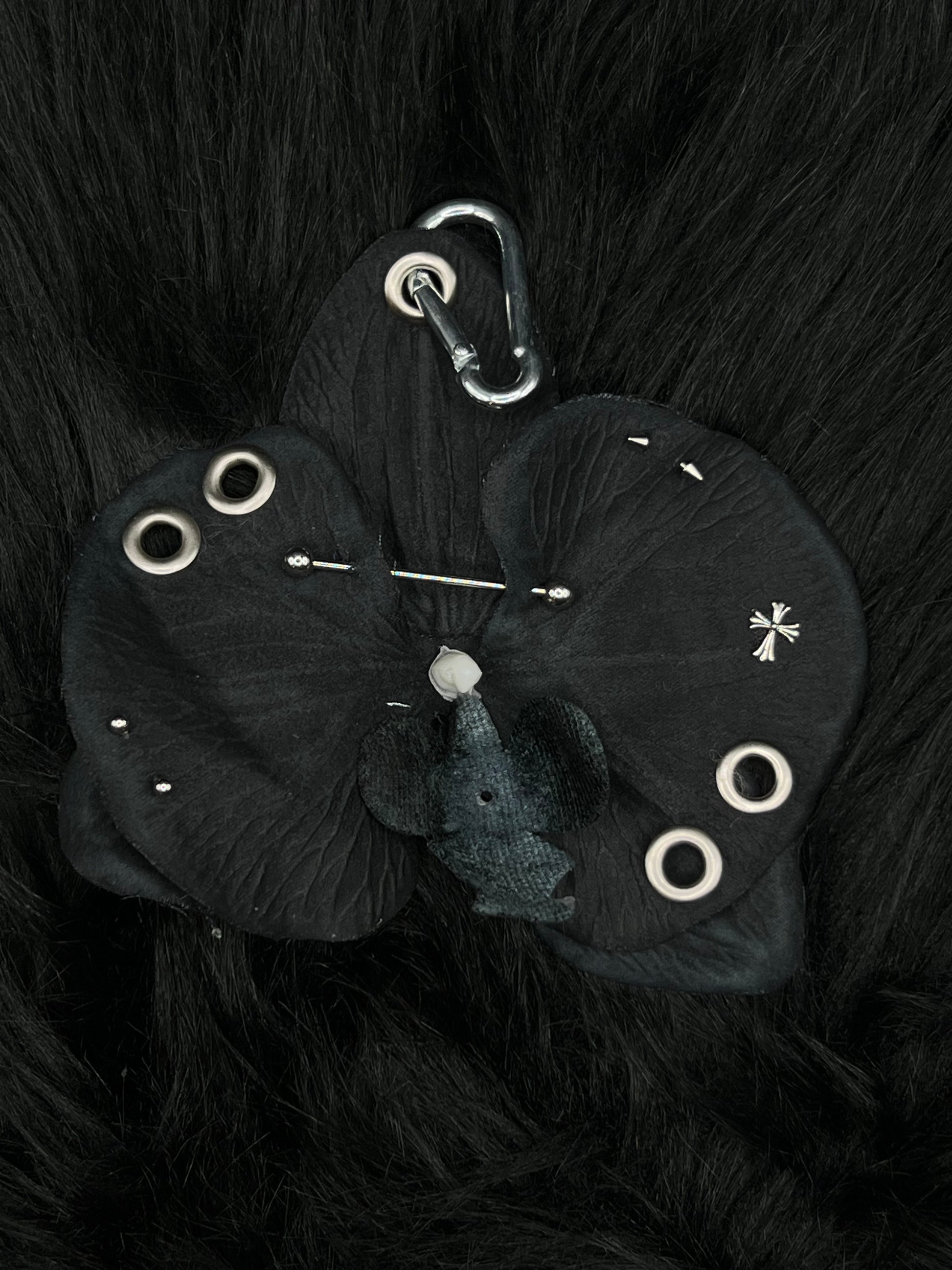 Handmade black pierced orchid keychain with silver hardware. This beautiful keychain features delicate orchid details and comes in two different versions to choose from. Perfect accessory for purses, keys, or bags.