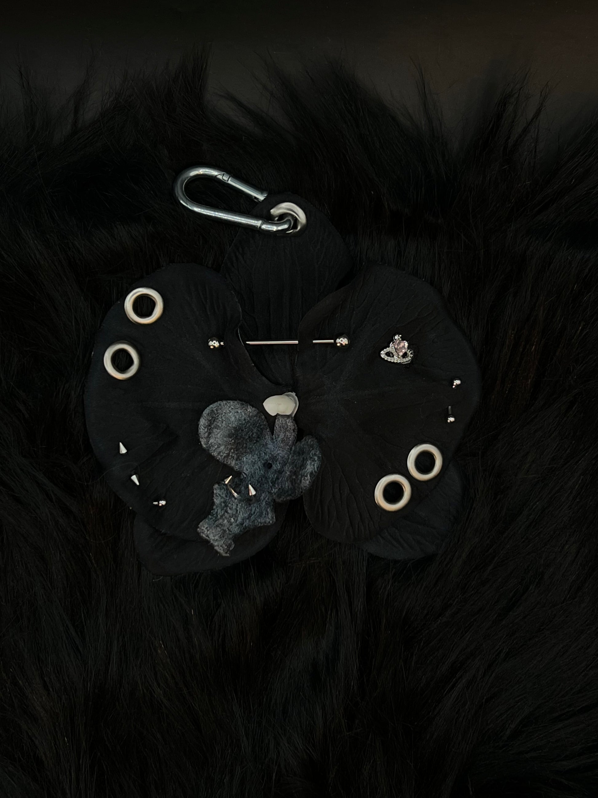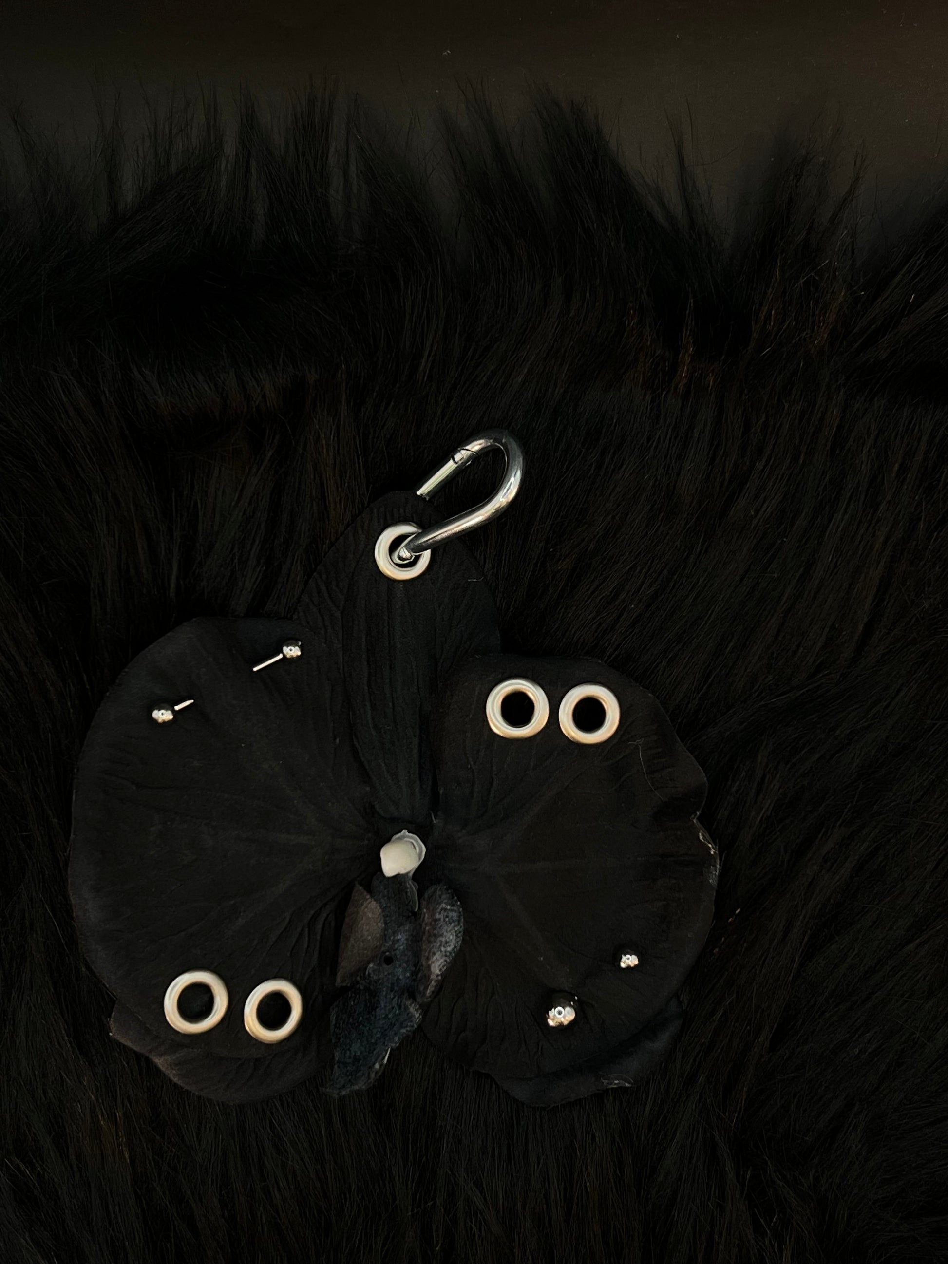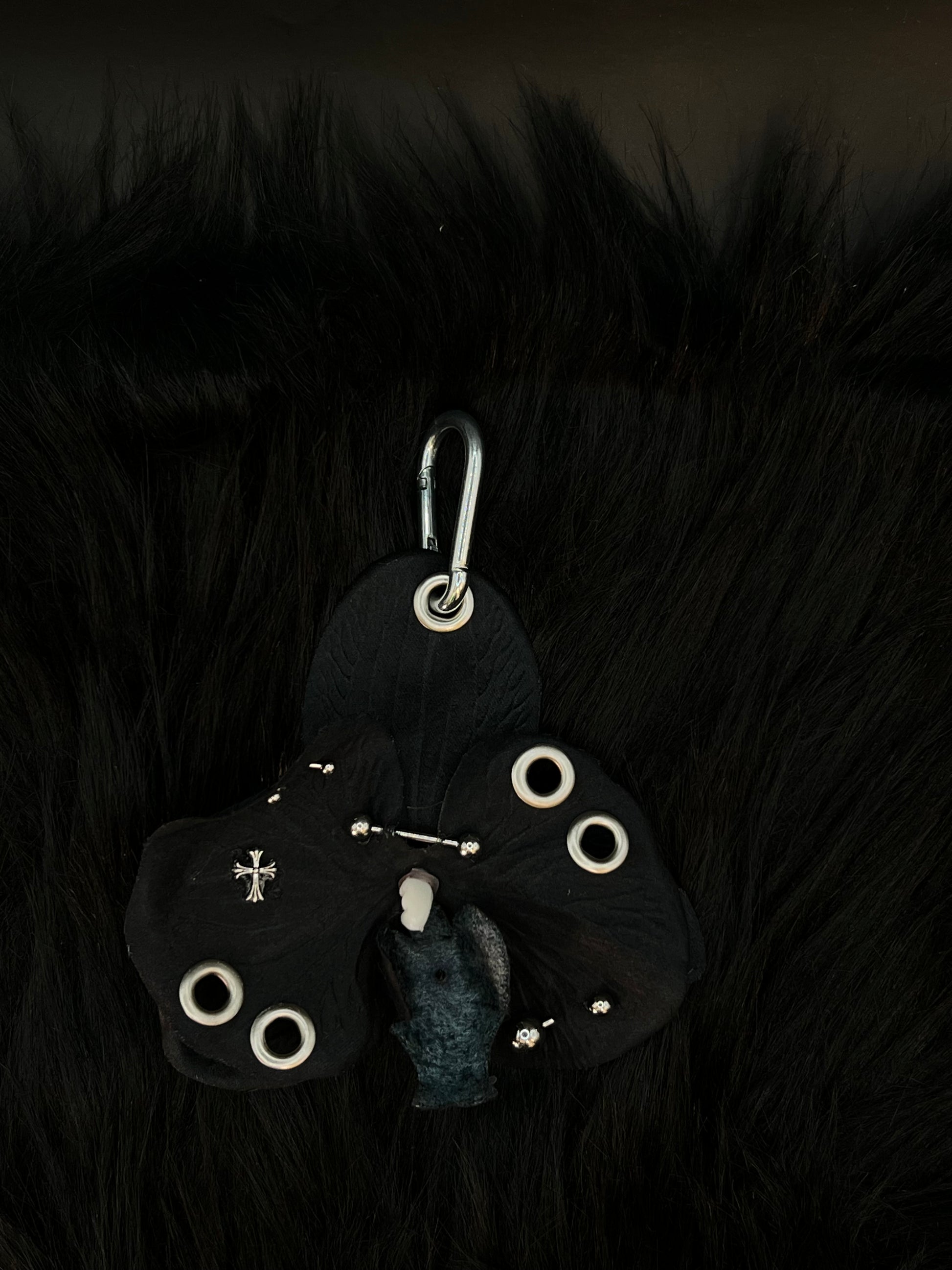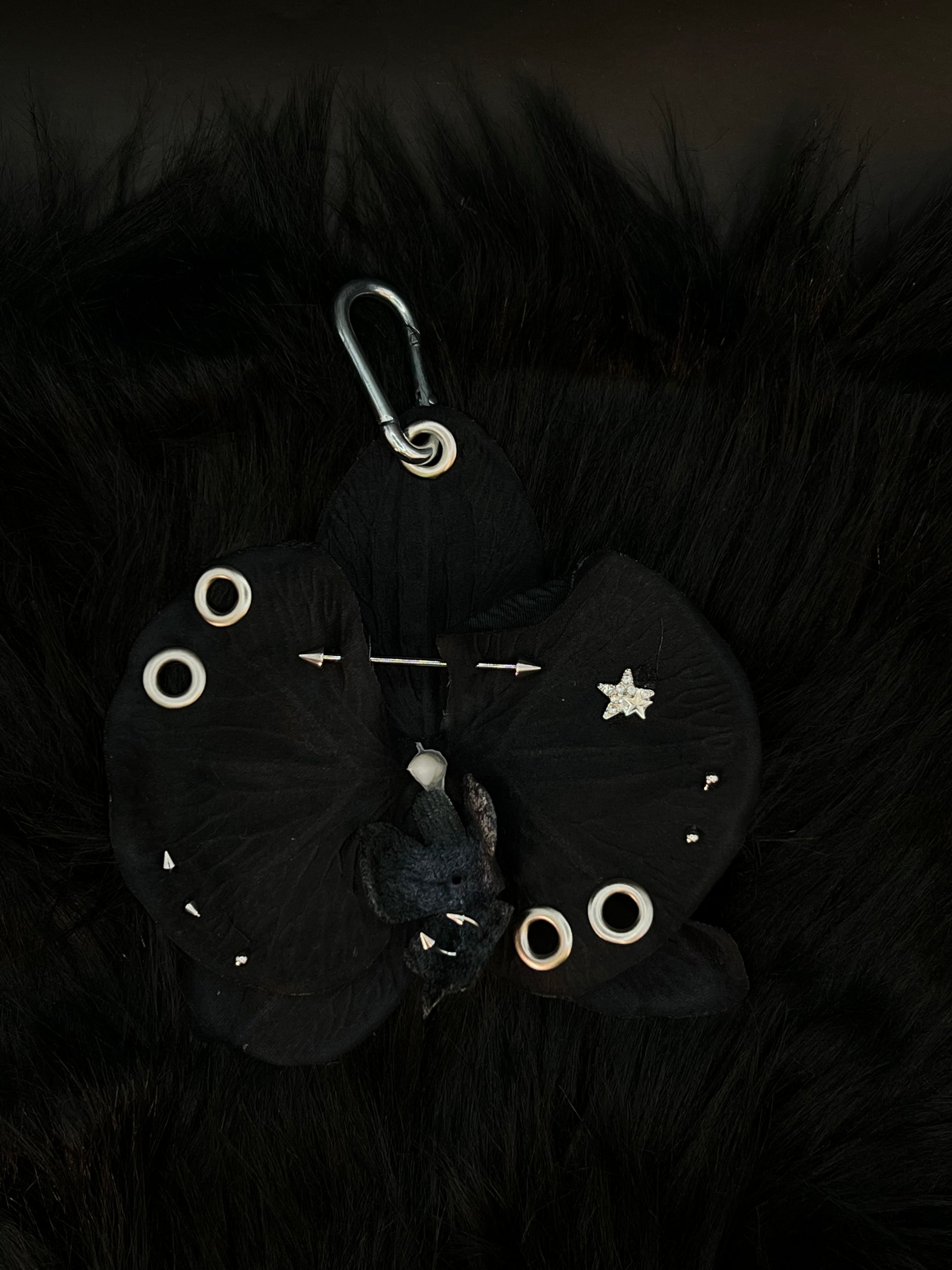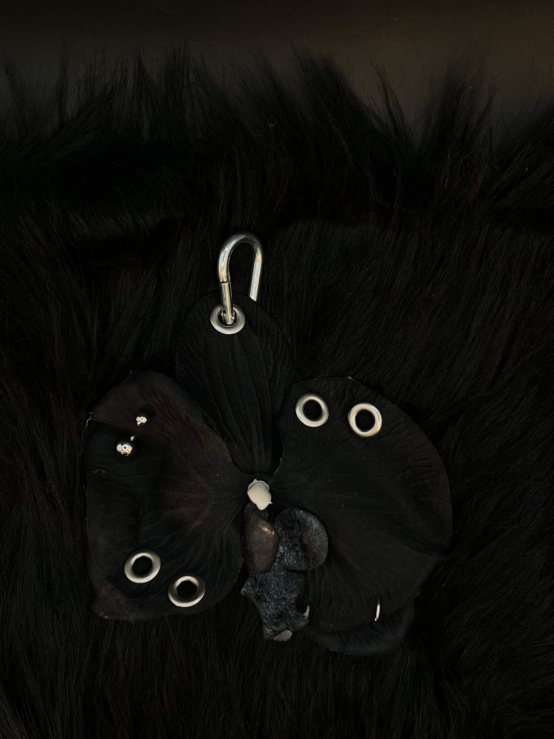 Handmade black pierced orchid keychain with silver hardware. This beautiful keychain features delicate orchid details and comes in two different versions to choose from. Perfect accessory for purses, keys, or bags.