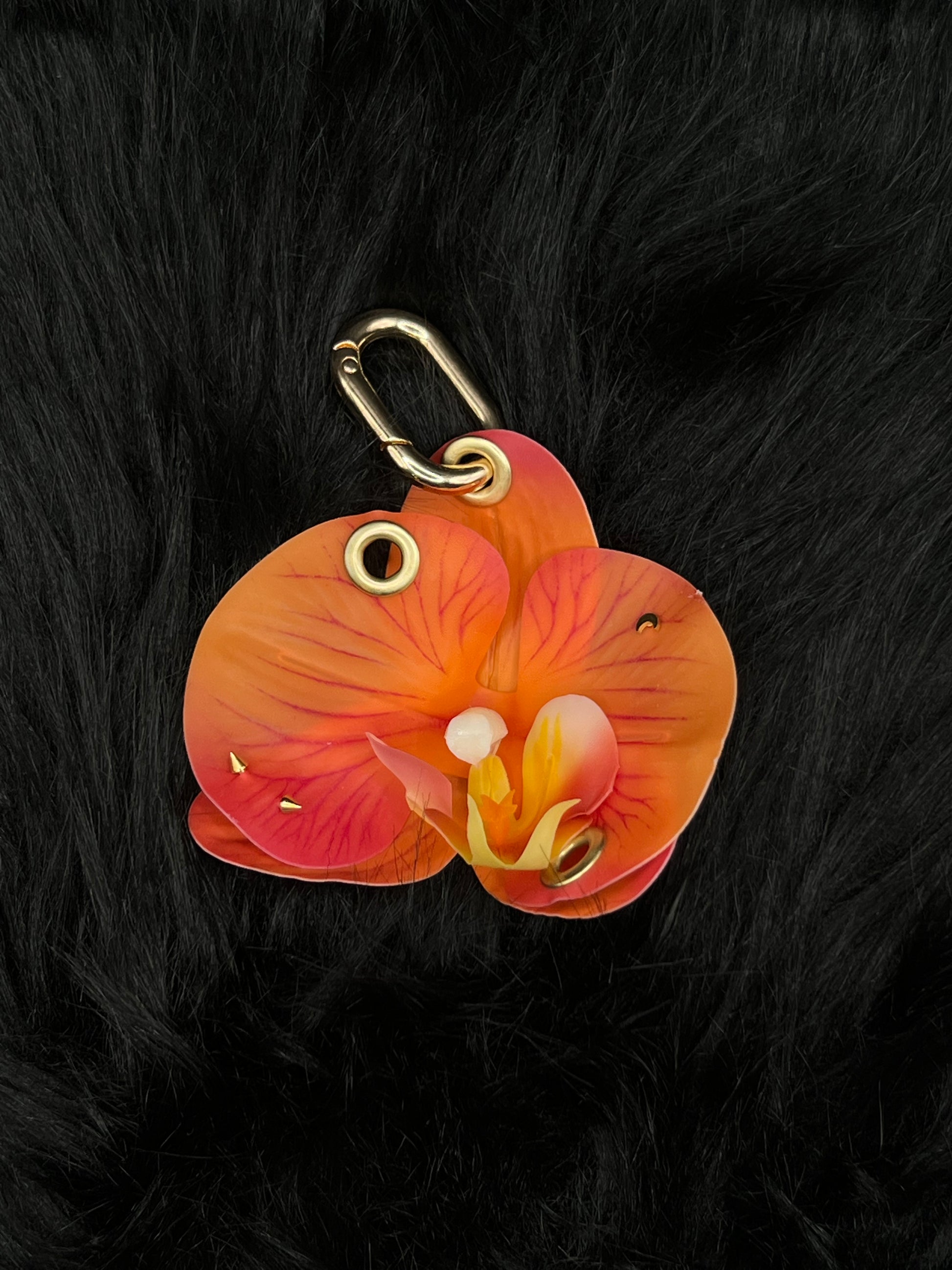 Handmade orange pierced orchid keychain with gold hardware. Perfect accessory for purses, keys, or bags.
