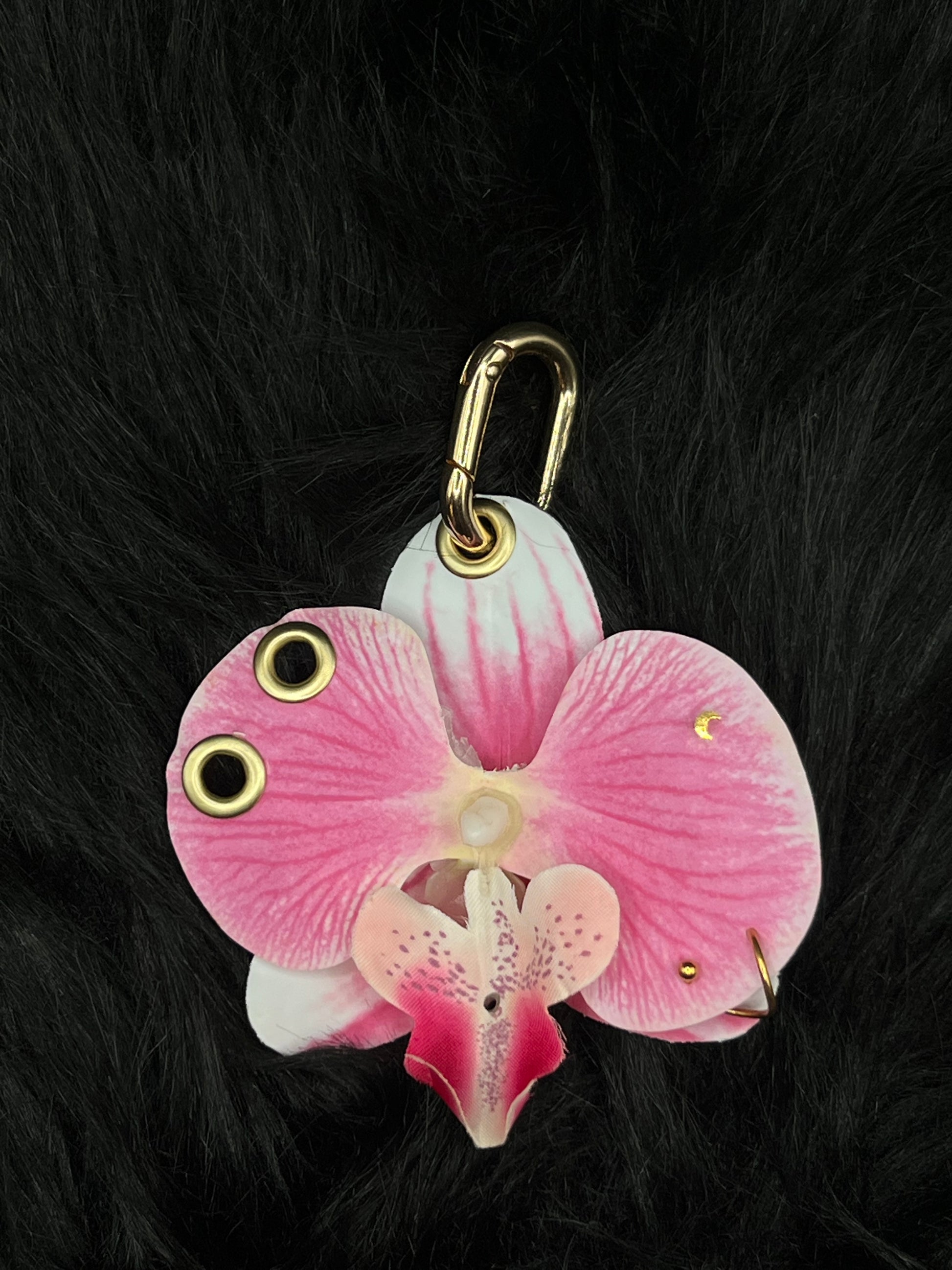 Handmade pink pierced orchid keychain with gold hardware. This beautiful keychain features delicate orchid details and comes in three different versions to choose from. Perfect accessory for purses, keys, or bags.