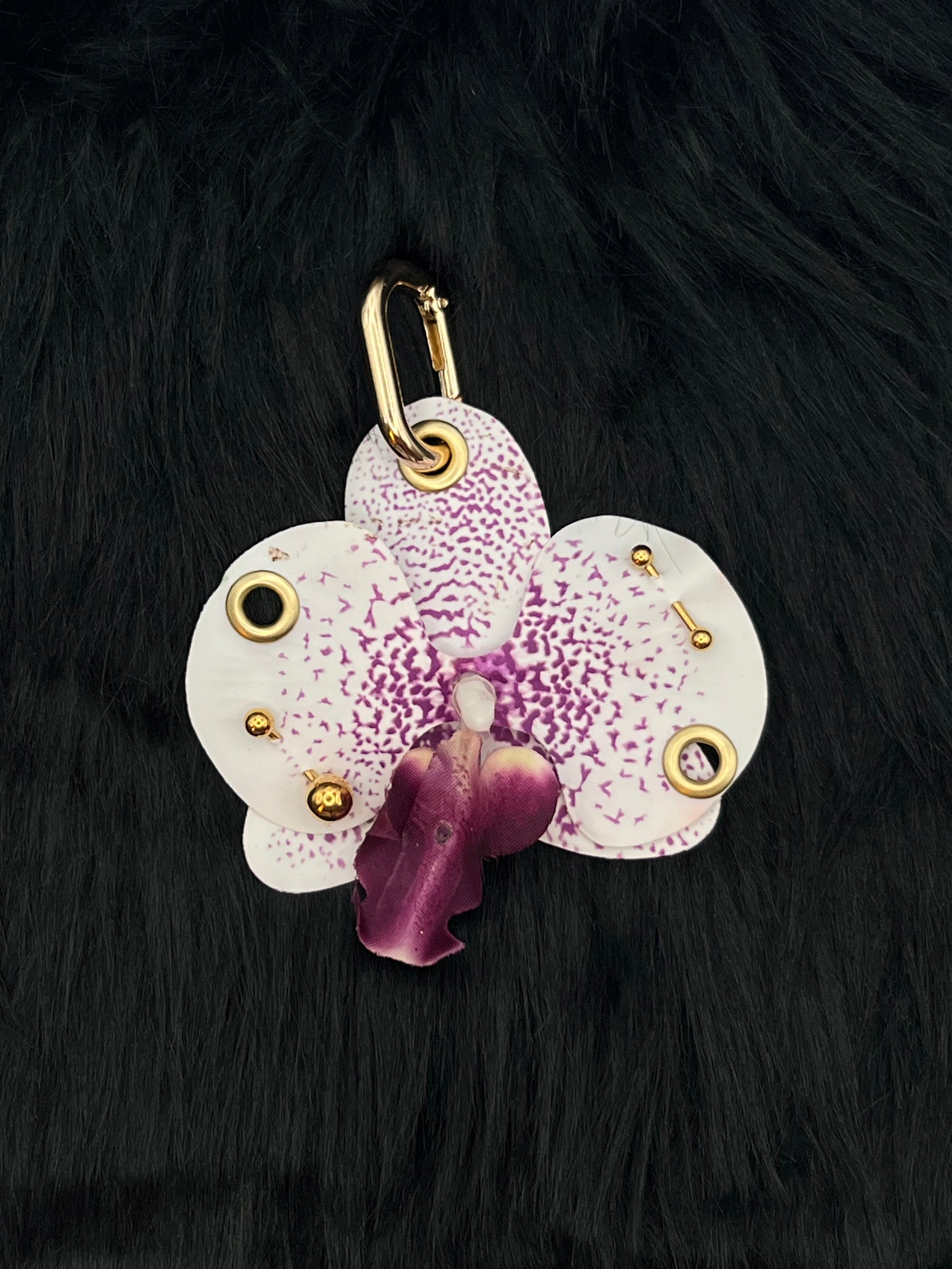 Handmade purple and white pierced orchid keychain with Gold hardware. This beautiful keychain features delicate orchid details and comes in 6 different versions to choose from. Perfect accessory for purses, keys, or bags.