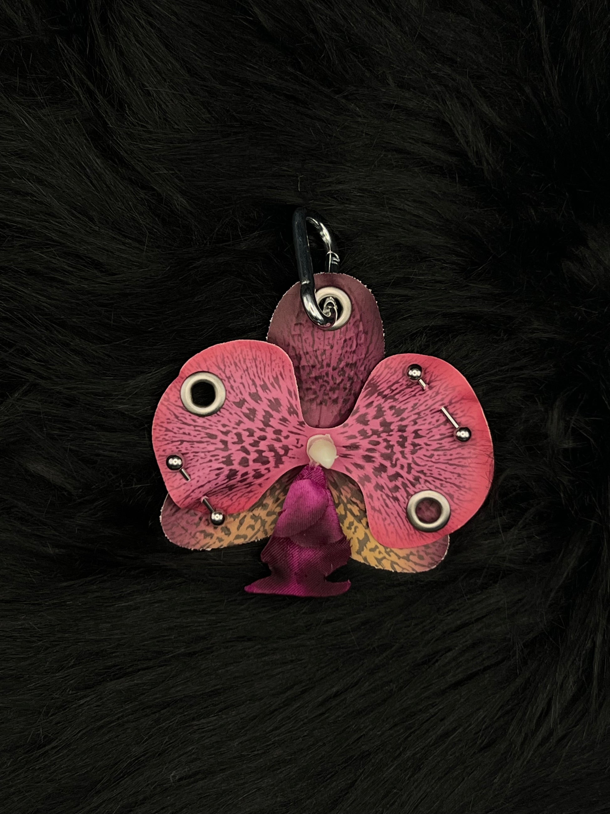 Handmade purple pierced orchid keychain with Gold hardware. This beautiful keychain features delicate orchid details and comes in three different versions to choose from. Perfect accessory for purses, keys, or bags.